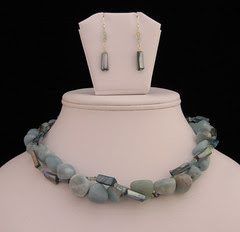 This necklace is two strands attached at the clasp and wrapped together. The large nuggets are a stone called Amazonite, a gemstone that is named after the Amazon River. Amazonite is not however found anywhere near the Amazon River. It is said that Amazonite is a stone that helps with self-expression and communication. The second strand is composed of dyed Mother of Pearl tubes, Citrine and an aqua colored stone called Apatite. The earrings are made with the dyed Mother of Pearl, Citrine and Apatite as well.